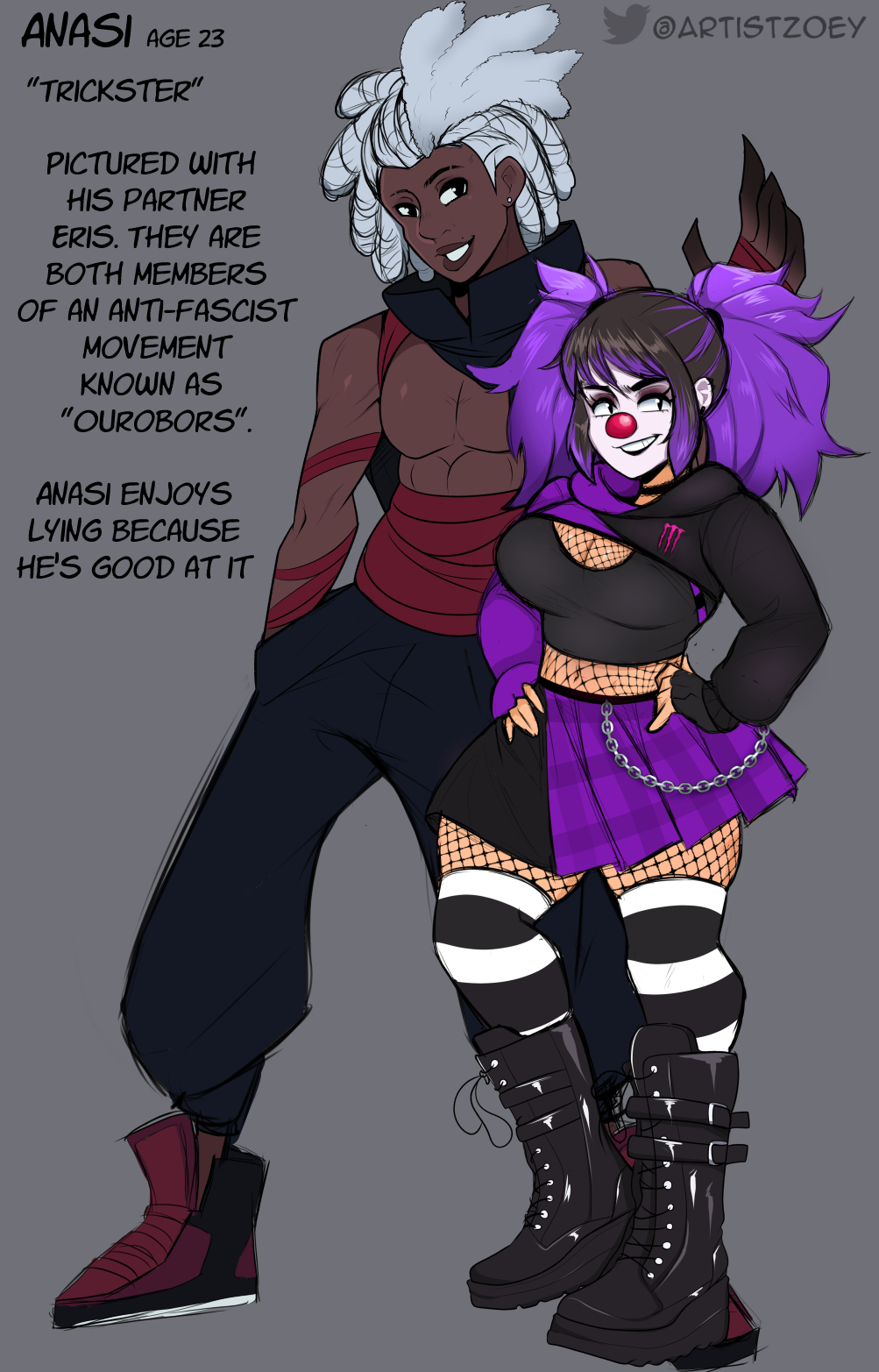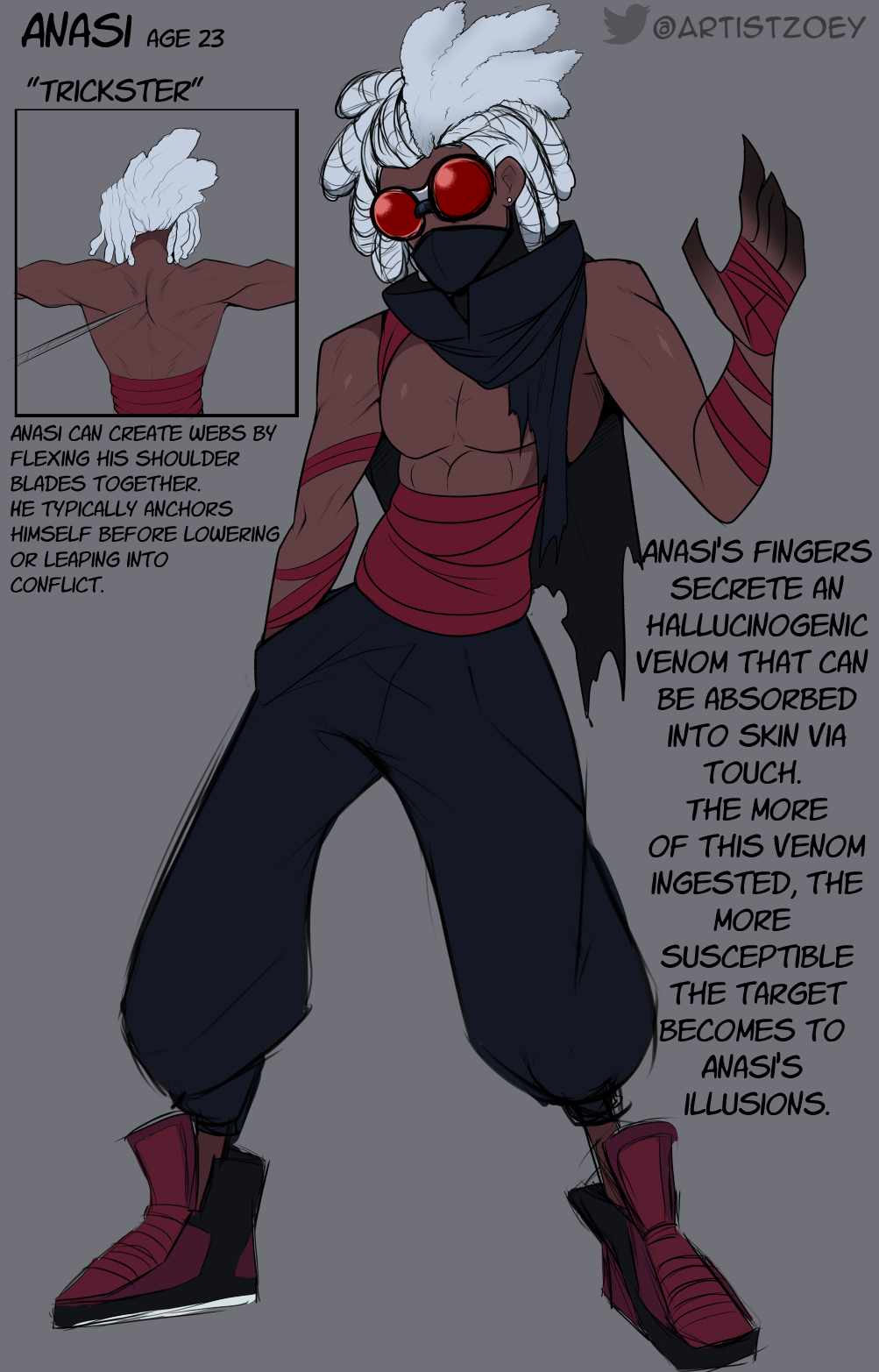 He is the spider god of chaos, using his charm and charisma to navigate the post-apocalypse easily. With the ability to transform into a spider, he's become a spy and informant for an anti-fascist group called Ouroboros who wants to keep Midgard from reconnecting with the rest of the 9 realms and the ruling class of gods that live there.
