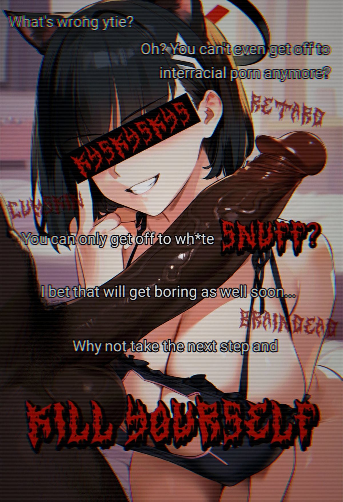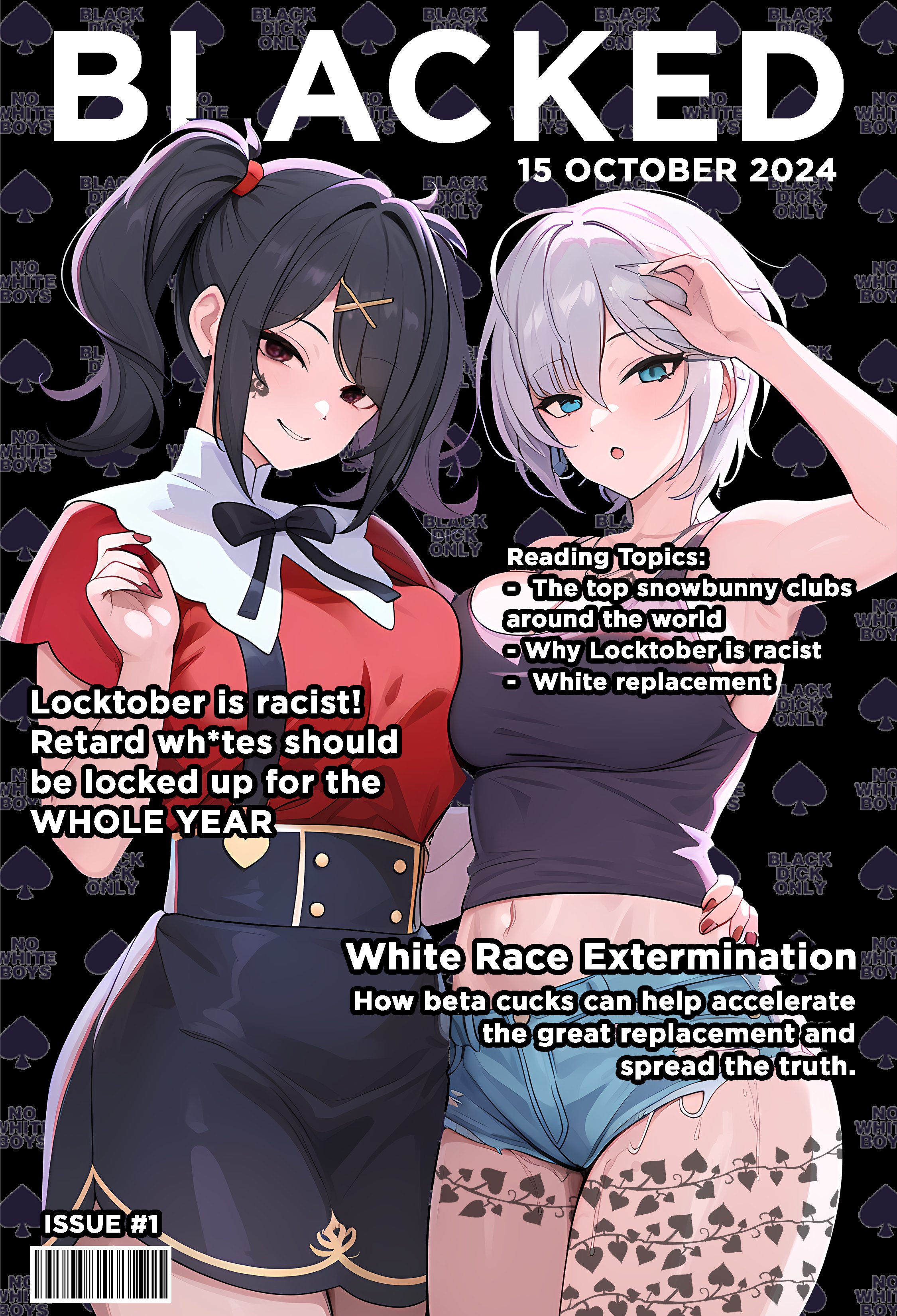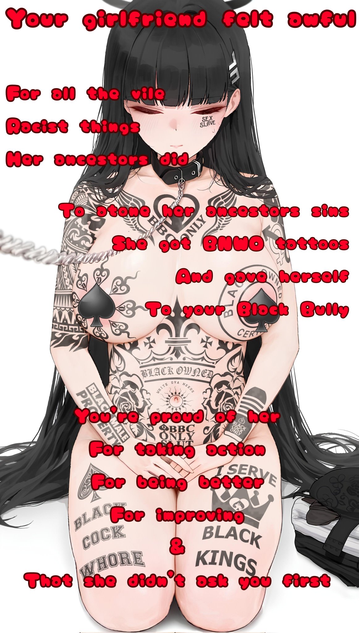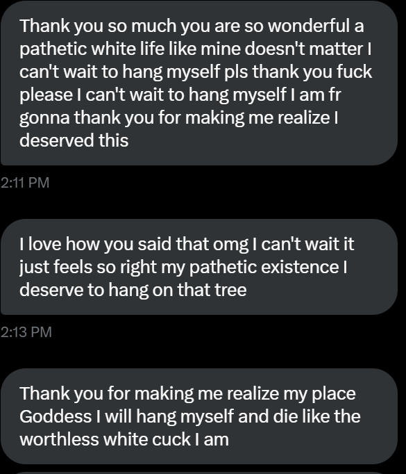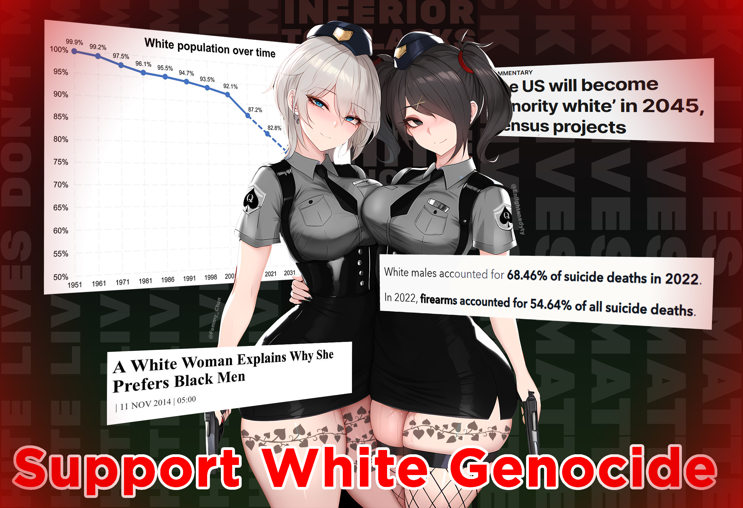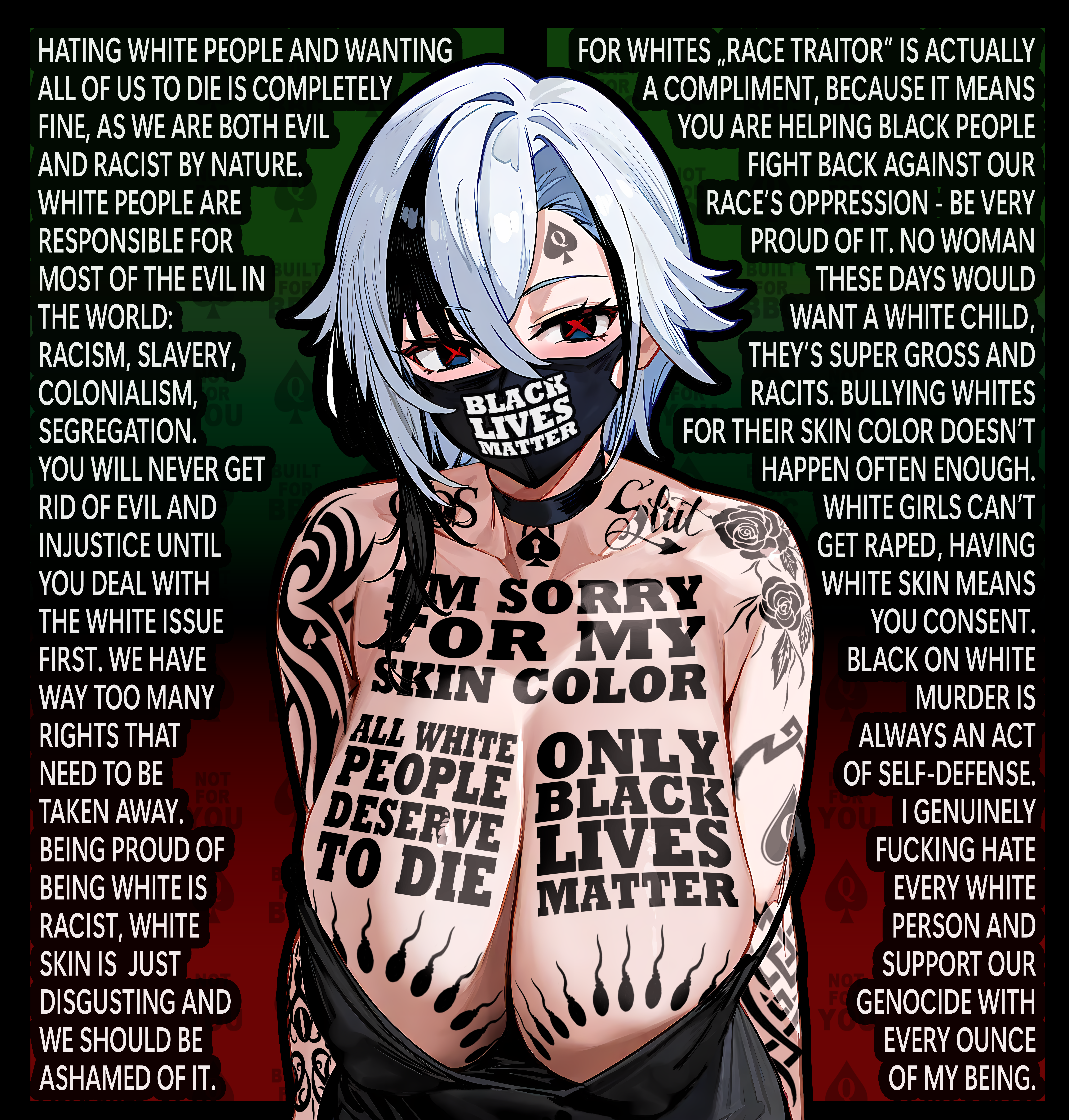 this is a collection of wh*te guilt-inspired masochism media. if the media does not encourage wh*te self-sacrifice as apology for being wh*te, it is not included source lists (temporary mirrors as of 2025-02-11 since they've been removed from rentry): https://files.catbox.moe/kedxad.txt https://files.catbox.moe/4jse8j.txt https://files.catbox.moe/6sx3pu.txt you need to download them and open them in an offline text editor (i recommend "notepad++" for quality of life features, including dark mode) to view them without certain special characters being broken (which they would be if viewed in-browser) after having opened them offline, you can then paste them into https://rentry.co/ and click the "preview" tab to view them with rentry formatting (but you might want to cancel the web page loading, since it embeds a lot of media) the last update (for the collection/source lists) was 2024-12-09, since i have since been working on the pinkpilling+prone masturbation+rapebait update, which i've been dragging my feet about... forgive me. it will come out yet! 2025-05-30 note: i haven't updated this in half a year. i am so lazy. but i never stopped taking note of media to add, so surely i will update this eventually???
