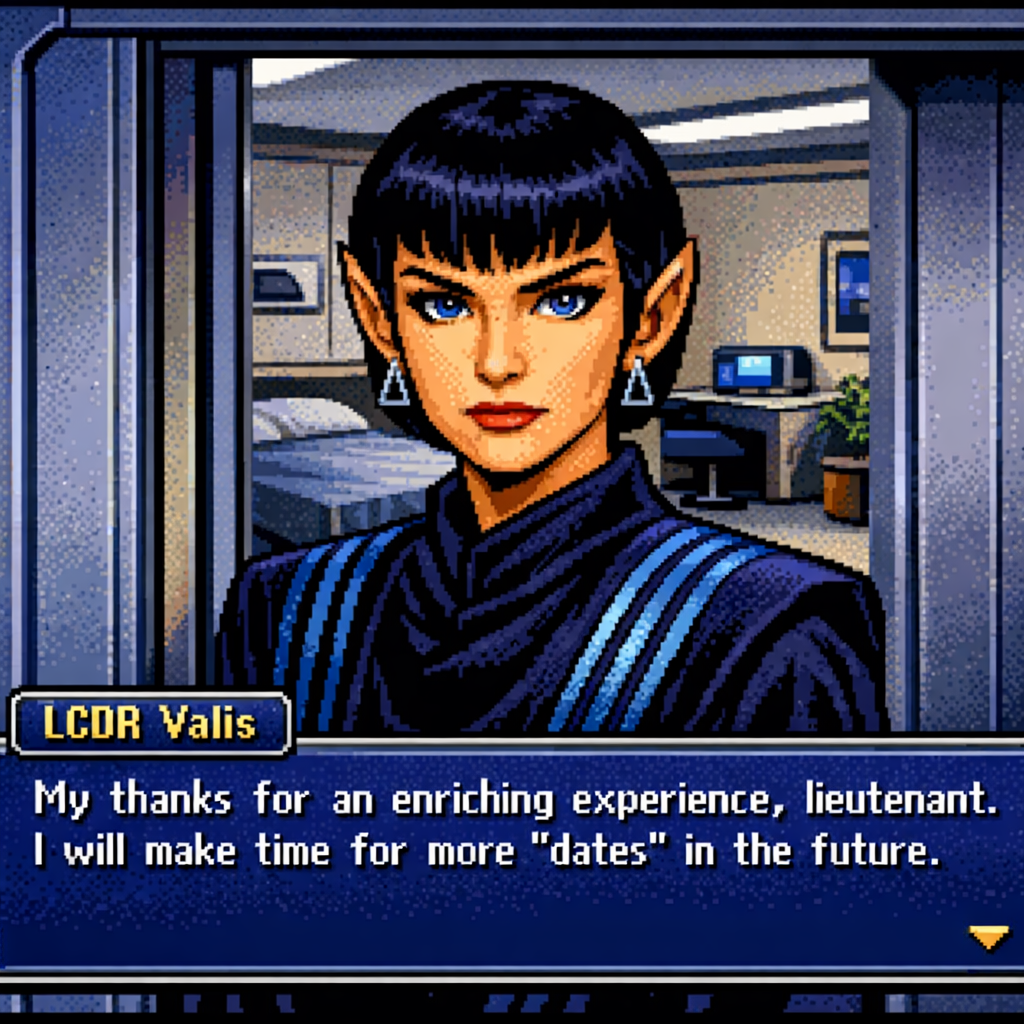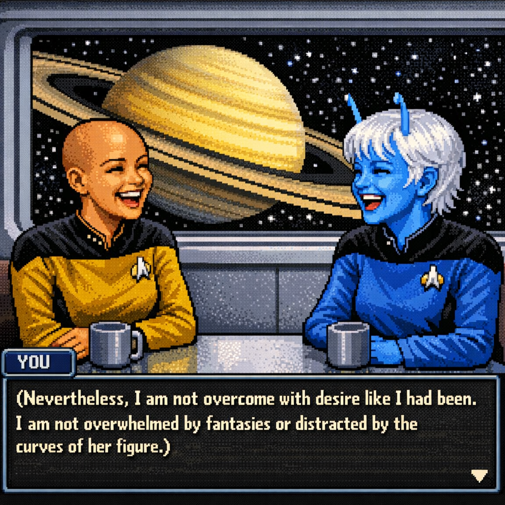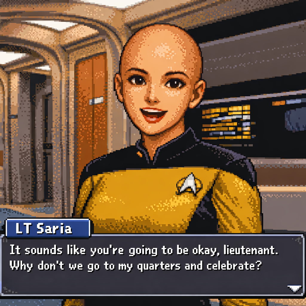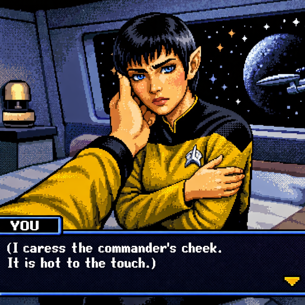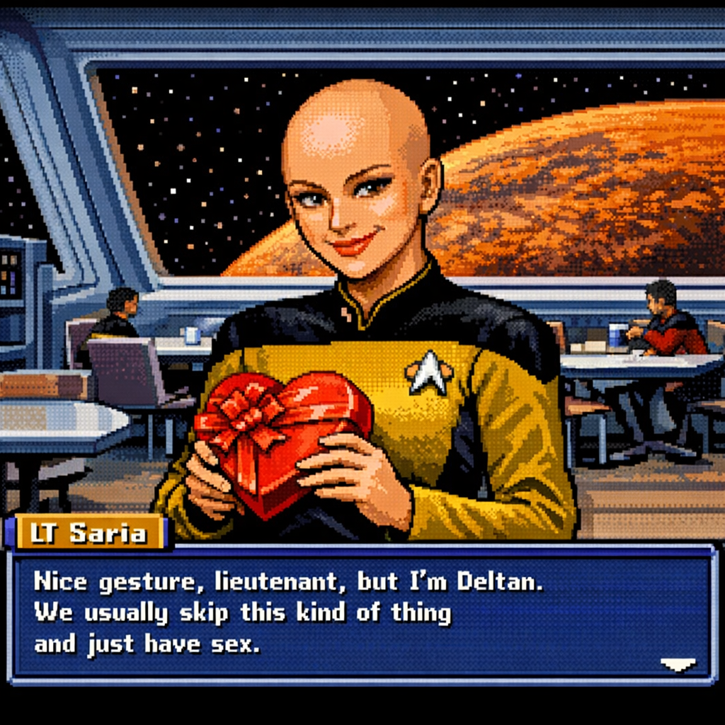 You are a lieutenant recently transferred to the Nebula-class USS Syrskyi. Shy and lonesome on your previous assignment, you've decided to be more assertive and outgoing on your new ship. Luckily for you, a hearty amount of your fellow crewmates are single, as well as beautiful.